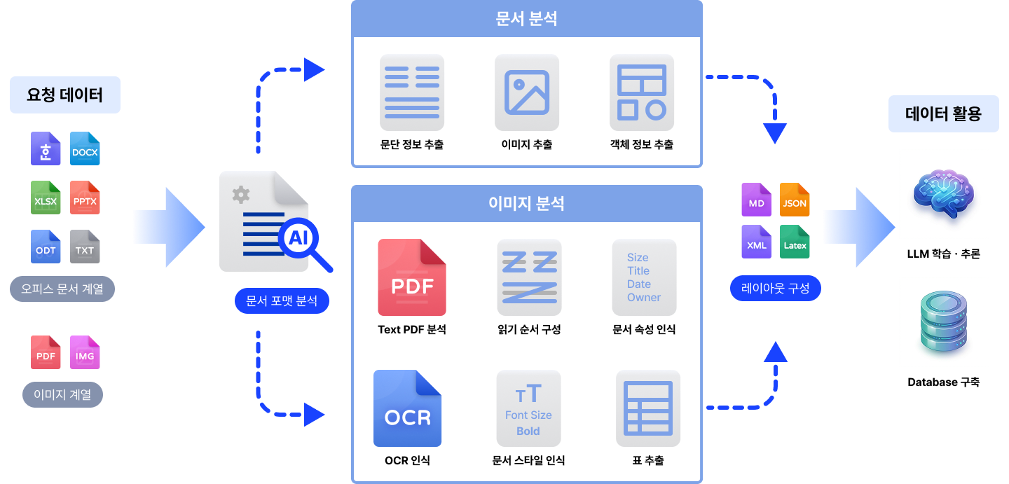 레인도큐마인드는 다양한 문서에서 표, 이미지 같은 시각적 정보와 복잡한 문서 구조 정보를 분석하여 Markdown과 XML 형식의 정형 데이터로 변환해주는 디지털 자산화 및 RAG를 활용한 LLM 구축 필수 솔루션입니다.